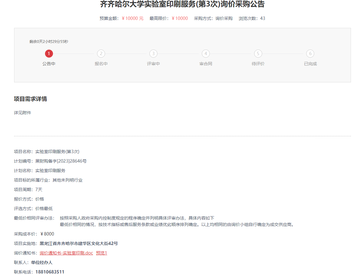 下一條:齊齊哈爾大學(xué)實驗室印刷服務(wù)(第2次)詢價采購公告(轉(zhuǎn)自黑龍江省政府采購網(wǎng))
