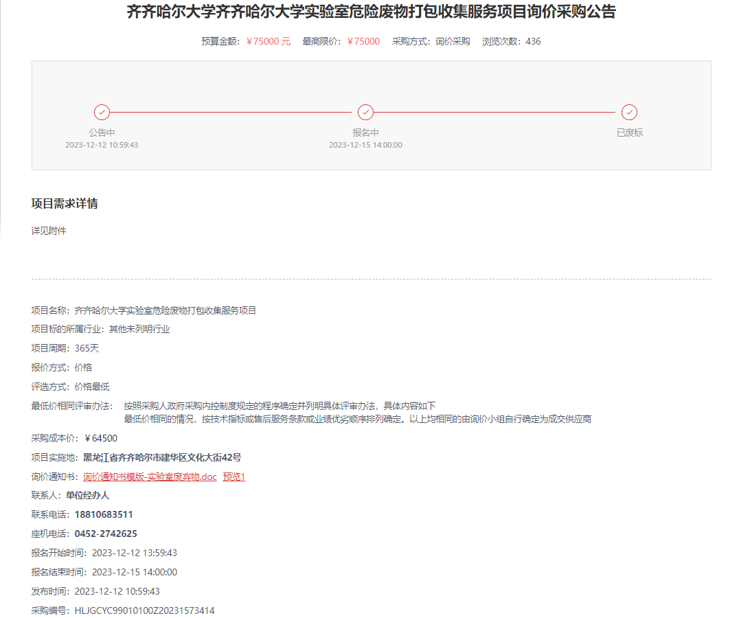 上一條:齊齊哈爾大學(xué)實(shí)驗(yàn)室危險(xiǎn)廢物打包收集服務(wù)項(xiàng)目(第2次)詢價(jià)采購(gòu)公告(轉(zhuǎn)自黑龍江省政府采購(gòu)網(wǎng))