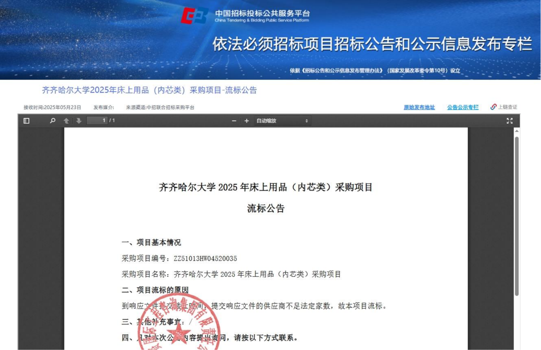 下一條:齊齊哈爾大學2025年床上用品(單罩類)采購項目-流標公告(轉自中國招標投標公共服務平臺)