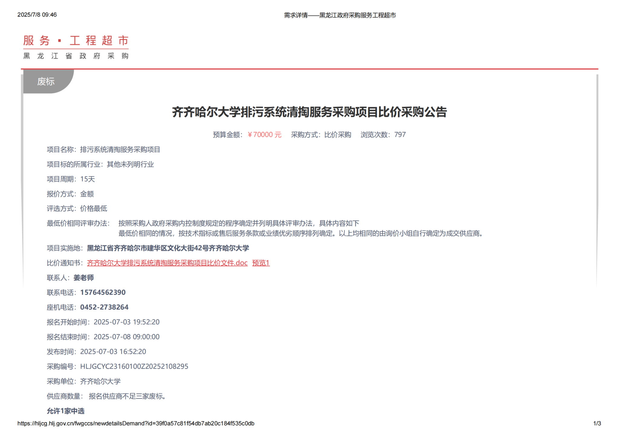 上一條:齊齊哈爾大學(xué)排污系統(tǒng)清掏服務(wù)采購項(xiàng)目(第2次)比價采購公告(轉(zhuǎn)自黑龍江省政府采購網(wǎng))