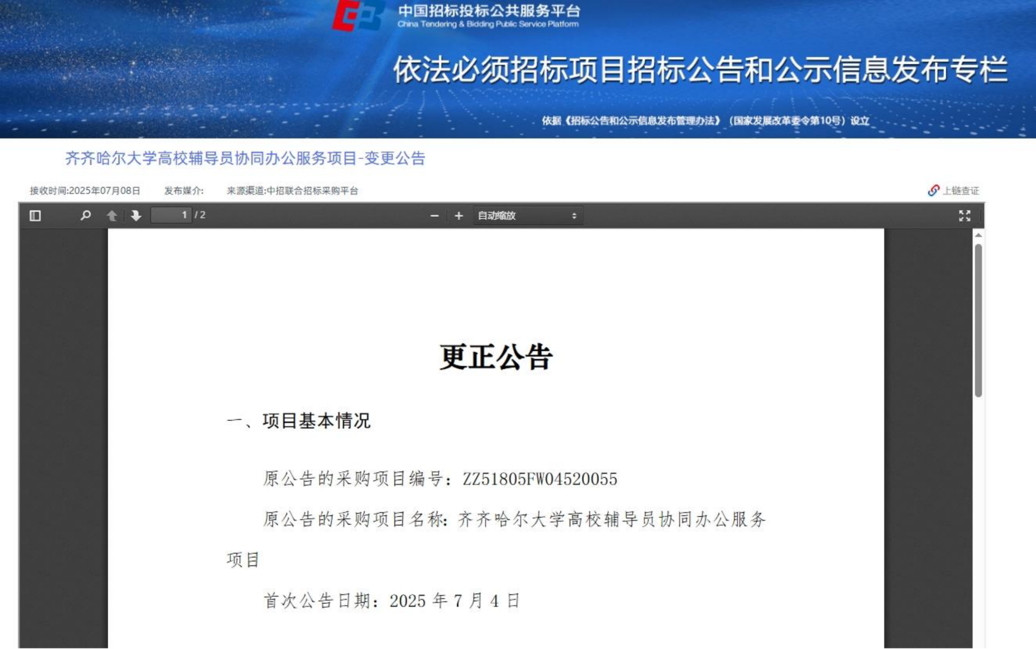 下一條:齊齊哈爾大學(xué)中區(qū)辦公樓等電梯維修保養(yǎng)項(xiàng)目(二次)競(jìng)爭(zhēng)性談判公告(轉(zhuǎn)自中國(guó)招標(biāo)投標(biāo)公共服務(wù)平臺(tái))