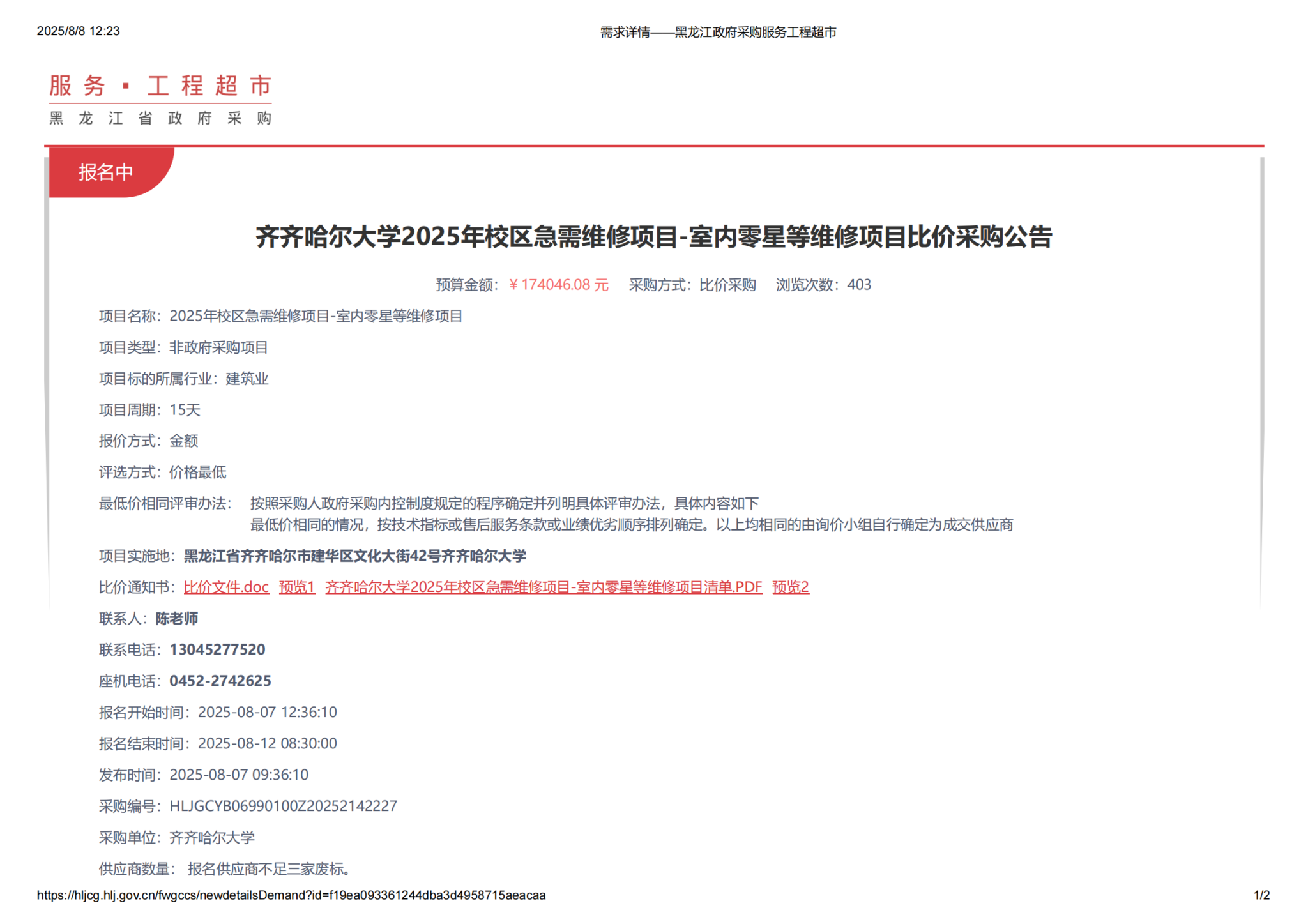 上一條:齊齊哈爾大學(xué)南校區(qū)國家市場監(jiān)管創(chuàng)新中心(工業(yè)大麻)實驗場地改造項目(二次)競爭性磋商公告(轉(zhuǎn)自黑龍江省政府采購網(wǎng))