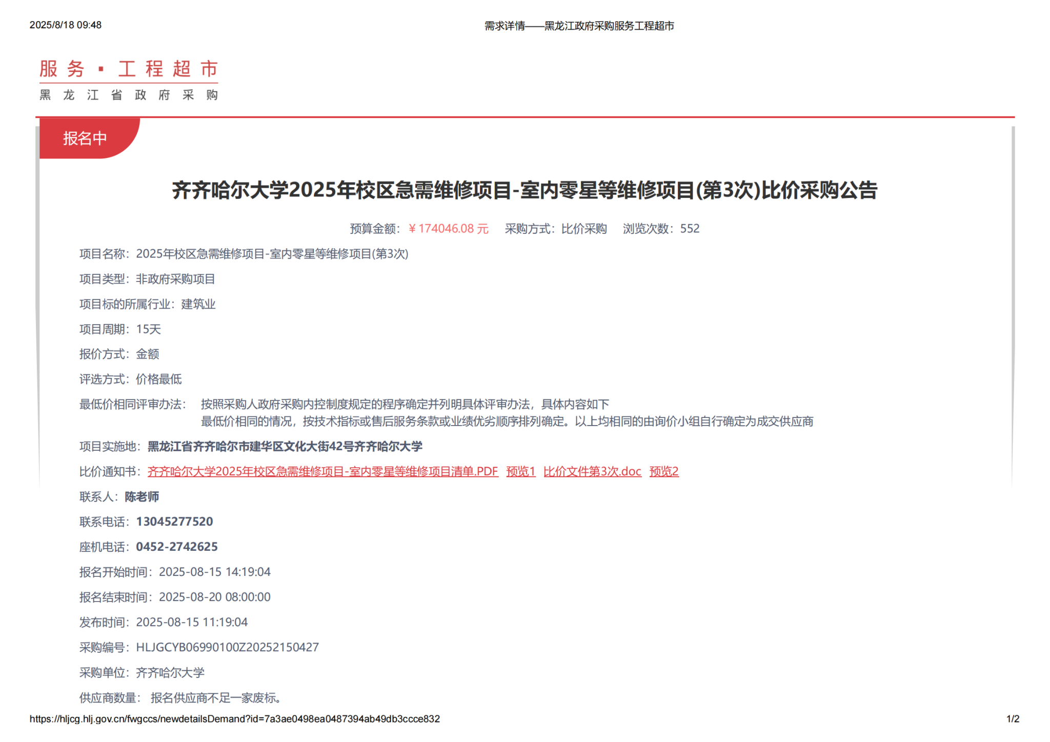 下一條:齊齊哈爾大學(xué)2025年校區(qū)急需維修項目-室內(nèi)零星等維修項目(第2次)比價采購公告-廢標(biāo)(轉(zhuǎn)自黑龍江省政府采購網(wǎng))