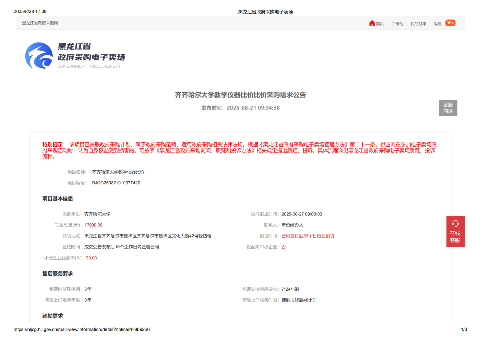 上一條:齊齊哈爾大學(xué)教學(xué)儀器比價(jià)采購(gòu)廢標(biāo)公告(轉(zhuǎn)自黑龍江省政府采購(gòu)網(wǎng))