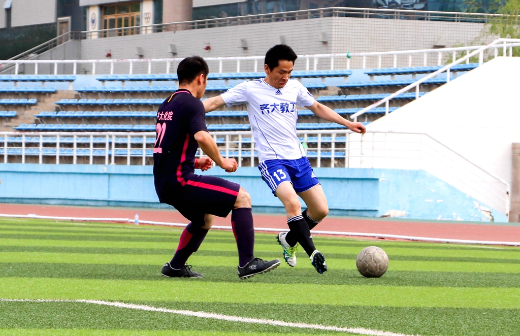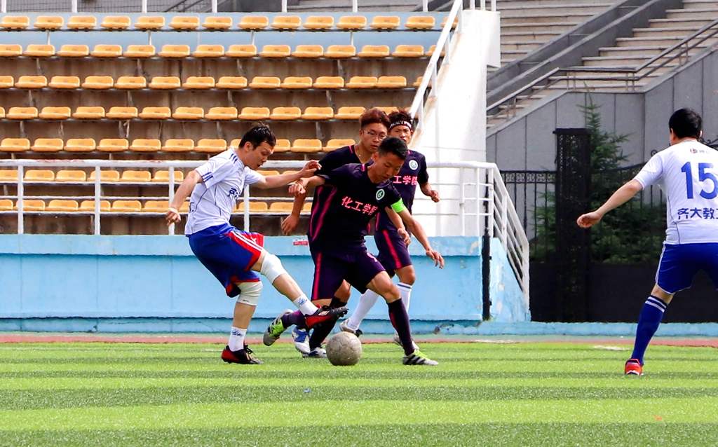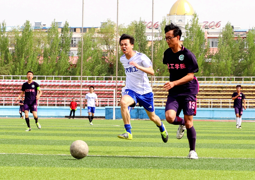 教職工隊(duì)是由來自學(xué)校各個(gè)部門、各個(gè)學(xué)院的老師組成的一支實(shí)力強(qiáng)勁的隊(duì)伍,比賽一開始,他們就有了不俗的表現(xiàn),打門、吊射對(duì)方球門,向?qū)Ψ桨l(fā)起了一系列的“狂轟亂炸”。而化工球隊(duì)也不甘示弱,作為富有朝氣的校園足球聯(lián)賽冠軍隊(duì),同學(xué)們對(duì)教職工隊(duì)的進(jìn)攻游刃有余地不斷回應(yīng)著,也多次展現(xiàn)出了完美的配合。由于實(shí)力上雙方勢均力敵,上半場經(jīng)歷了漫長的拉鋸戰(zhàn),雙方相繼打門成功,比分變成了1:1,上半場比賽也落下了帷幕。