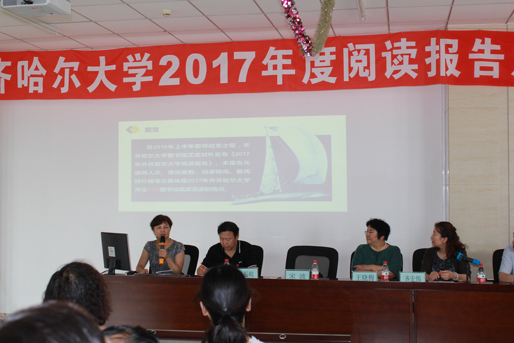 為了體現(xiàn)我校師生利用圖書館資源的情況,從不同的角度解讀了我校師生的閱讀傾向和閱讀習(xí)慣,宋波用詳實的數(shù)據(jù)講解了2017年度齊齊哈爾大學(xué)閱讀報告。報告中分別對紙質(zhì)資源和數(shù)據(jù)庫資源的使用情況進行了解讀,充分分析了我校本科和研究生閱讀現(xiàn)狀。圖書館近兩年用數(shù)據(jù)的方式發(fā)布了全校的閱讀報告,這既是對圖書館一年工作的總結(jié),也是對我校讀書現(xiàn)狀的數(shù)據(jù)支持。