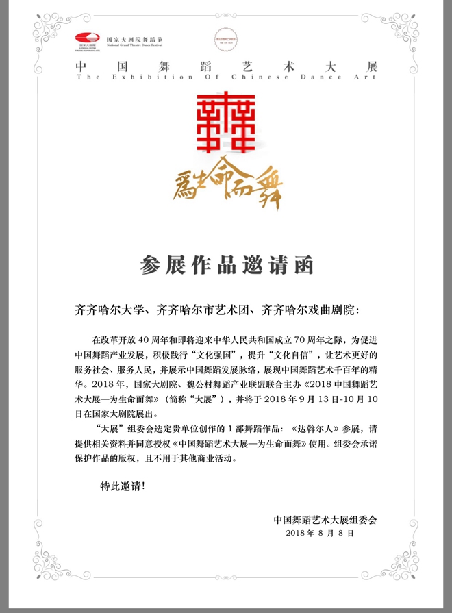 在改革開放40周年和即將迎來中華人民共和國(guó)成立70周年之際,為促進(jìn)中國(guó)舞蹈產(chǎn)業(yè)發(fā)展,積極踐行“文化強(qiáng)國(guó)”,提升“文化自信”,展現(xiàn)中國(guó)舞蹈藝術(shù)千百年的精華,2018年9月13日-10月10日,由國(guó)家大劇院、魏公村舞蹈產(chǎn)業(yè)聯(lián)盟聯(lián)合主辦的《2018中國(guó)舞蹈藝術(shù)大展—為生命而舞》,在國(guó)家大劇院展出。大展組委會(huì)選定由齊齊哈爾大學(xué)和齊齊哈爾市戲曲劇院聯(lián)合打造的大型風(fēng)情音畫《達(dá)斡爾人》參展。
