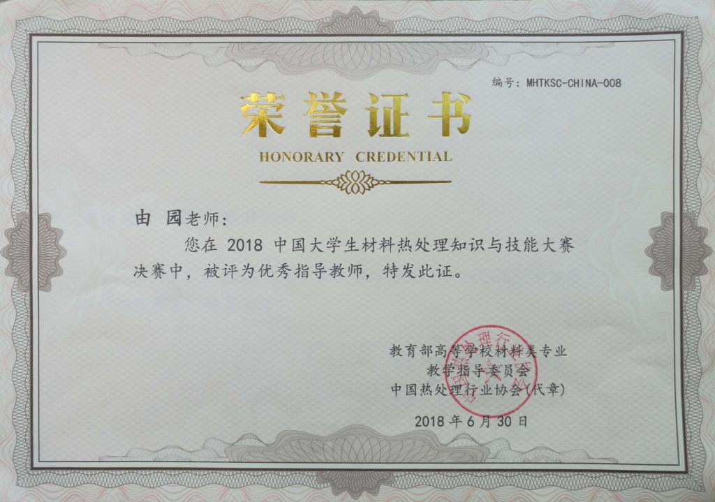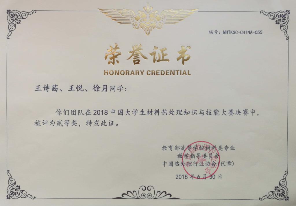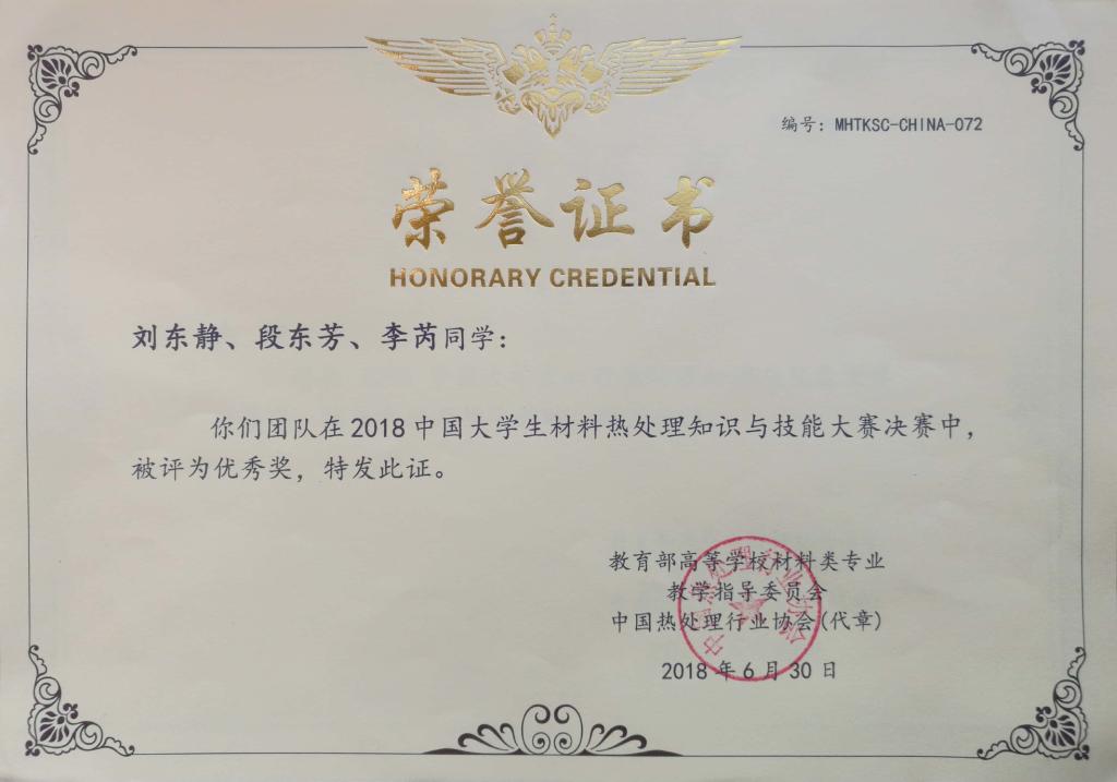 日前,2018中國大學(xué)生材料熱處理知識與技能大賽落下帷幕。本屆大賽由中國熱處理行業(yè)協(xié)會、教育部高等學(xué)校材料類專業(yè)教學(xué)指導(dǎo)委員會主辦,中國熱處理行業(yè)協(xié)會教育培訓(xùn)工作委員會、哈爾濱工業(yè)大學(xué)、河北工業(yè)大學(xué)、福州大學(xué)、西南交通大學(xué)共同承辦。我校材料科學(xué)與工程學(xué)院王詩茜、王悅、徐月、劉東靜、段東芳和李芮6名學(xué)生分成2隊參加比賽,分別榮獲二等獎和優(yōu)秀獎,材料化學(xué)專業(yè)副教授由園博士被評為優(yōu)秀指導(dǎo)教師。