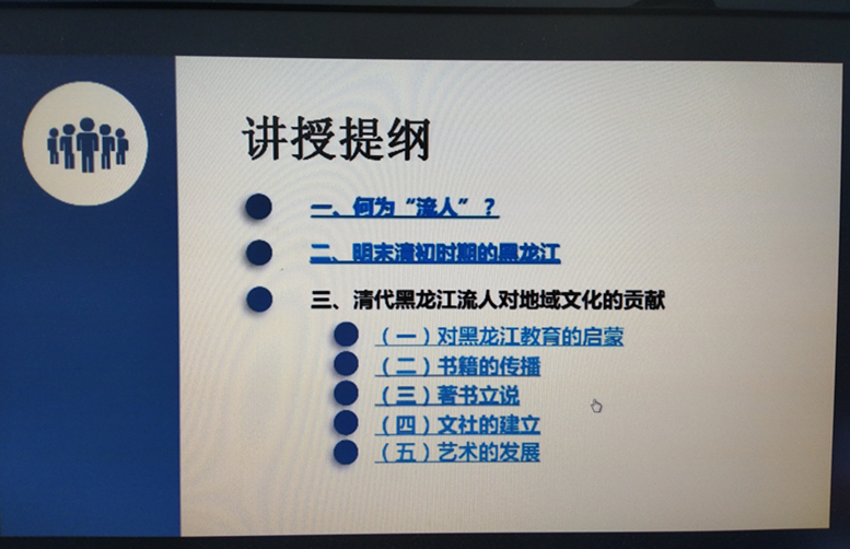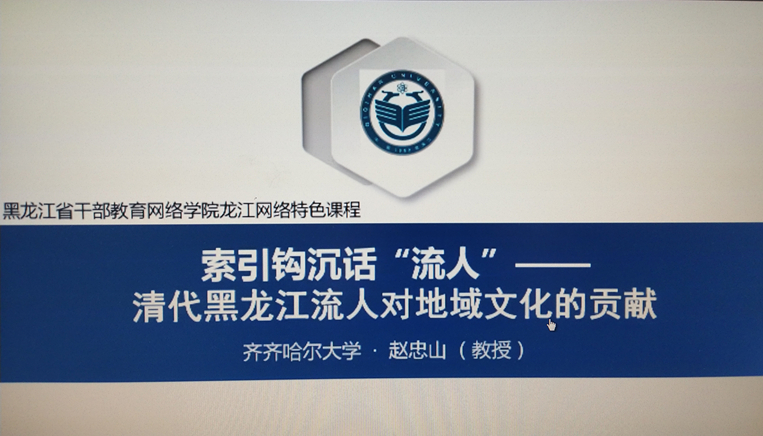 趙忠山教授旁征博引、索引鉤沉,從清代黑龍江流人對地域教育的啟蒙 、書籍的傳播、著書立說、文社的建立、藝術(shù)的發(fā)展、宗教信仰的改變等諸多方面進行了精彩的講授,課程講授生動流暢、圖文并茂、據(jù)經(jīng)用典、精彩紛呈、體現(xiàn)了齊大學者的風范。課程深入淺出地闡述了黑龍江文化的淵源和流人啟蒙的重大意義,為黑龍江文化的研究具有重要參考與借鑒意義。正像課程結(jié)束語說的那樣:“黑龍江是滿清皇室龍興之地,滿清時期經(jīng)濟文化相當落后,被稱之為蠻荒絕塞之地。這里居住著滿族、達斡爾、赫哲等眾多少數(shù)民族,他們對中原文化不了解,清代黑龍江文化流人的到來,傳播了中原文化與文明,啟蒙并推動了黑龍江地域文化的發(fā)展和繁榮!”