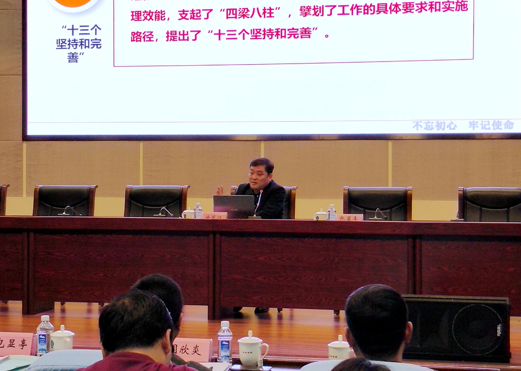 報(bào)告會(huì)上,徐鳳江從推進(jìn)國(guó)家治理體系和治理能力現(xiàn)代化的重大意義、國(guó)家制度和國(guó)家治理體系的優(yōu)勢(shì)與未來(lái)工作部署、堅(jiān)持中國(guó)特色社會(huì)主義群團(tuán)發(fā)展道路,努力建設(shè)黨領(lǐng)導(dǎo)下的現(xiàn)代化青年政治組織等方面,對(duì)黨的十九屆四中全會(huì)精神和習(xí)近平總書(shū)記關(guān)于國(guó)家制度和治理體系建設(shè)重要思想做了詳細(xì)分析和解讀,并結(jié)合《中共中央關(guān)于加強(qiáng)和改進(jìn)群團(tuán)工作的意見(jiàn)》《青年中長(zhǎng)期發(fā)展規(guī)劃》對(duì)新時(shí)代共青團(tuán)的職責(zé)使命以及當(dāng)代青年的政治任務(wù)做了詳細(xì)的講解。