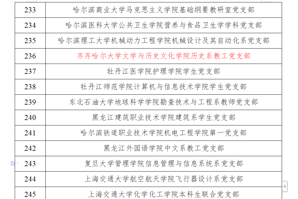 2019年12月27日,教育部下發(fā)了《教育部辦公廳關(guān)于公布第二批全國黨建工作示范高校、標(biāo)桿院系、樣板支部培育創(chuàng)建單位名單的通知》,通知公布了入選第二批新時(shí)代高校黨建示范創(chuàng)建和質(zhì)量創(chuàng)優(yōu)的全國10個(gè)黨建工作示范高校、99個(gè)黨建工作標(biāo)桿院系、999個(gè)黨建工作樣板支部。我校文學(xué)與歷史文化學(xué)院歷史系-東北地區(qū)中日關(guān)系史研究會(huì)聯(lián)合教師黨支部(以下簡稱“歷史系教師黨支部”)獲批“全國黨建工作樣板支部”。
