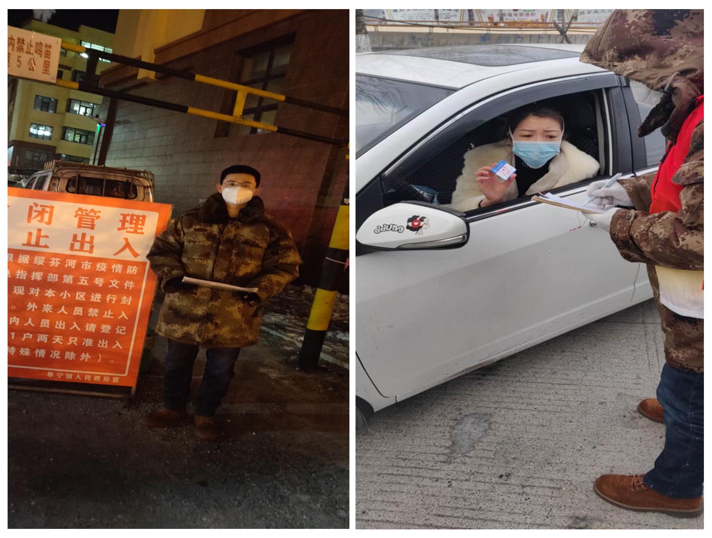 生物技術(shù)181班的孫晨家住在綏芬河市,2016年他曾應(yīng)征入伍是一名退役軍人。2月6日下午,孫晨在綏芬河市退伍兵群里看到了市退役軍人事務(wù)局發(fā)出的退役軍人志愿服務(wù)隊召集令,便第一時間同退役軍人事務(wù)局聯(lián)系,加入到了社區(qū)志愿服務(wù)的隊伍中。孫晨每天志愿服務(wù)8小時,上午兩個小時,下午兩個小時,夜晚4個小時,直到凌晨!他不畏嚴(yán)寒,對出入小區(qū)業(yè)主進(jìn)行測溫登記,做到來車、來人必查,嚴(yán)控外來車輛及人員入內(nèi),同時,還組織5名居民志愿者到小區(qū)門口參與執(zhí)勤。孫晨說:“離軍不離黨,退伍不褪色,疫情就是命令,防控就是責(zé)任。作為一名當(dāng)代大學(xué)生,更作為一名退役軍人,哪里有需要,哪里就會有退役軍人志愿者的身影,在疫情面前,我要用實際行動為黨旗增輝,為軍旗添彩?!?/p>