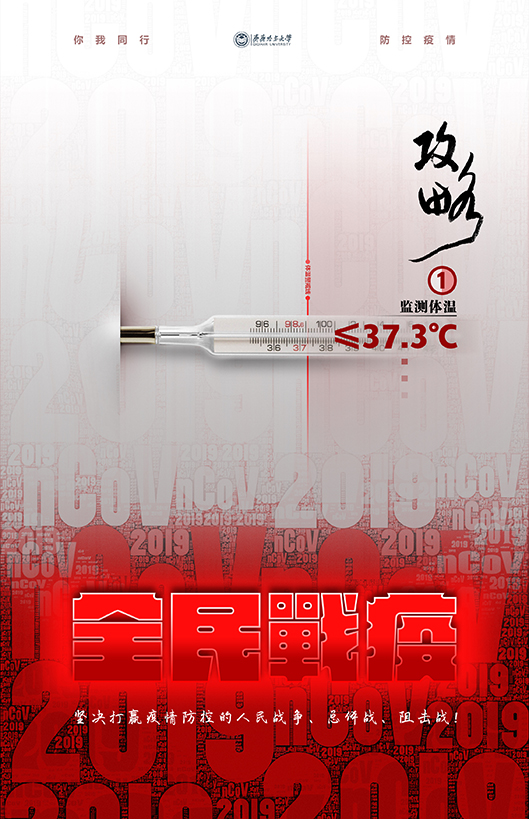 設計簡介:以小面積的紅色與大面積的灰白色做對比,2019nCoV作為背景基礎圖形要素,揭示了目前防疫工作的嚴峻性。招貼以“全民戰(zhàn)疫”為系列設計;告知普通民眾在居家隔離期間應該重視的日常問題。這一幅為測體溫,展現(xiàn)了普通民眾能從小處做起,管理好個人和家庭的同時,也同樣為全國人民戰(zhàn)勝疫情做出了自己的貢獻?。ǜ兄x同事長春的助力,“攻略”二字升華了設計主題)