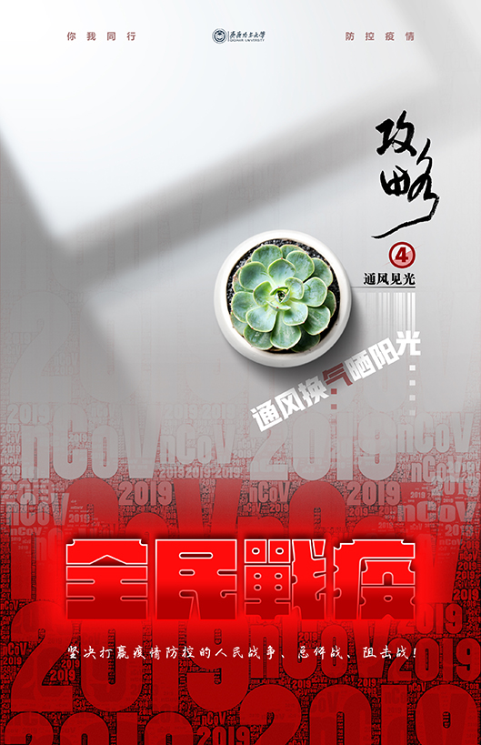 設計簡介:以小面積的紅色與大面積的灰白色做對比,2019nCoV作為背景基礎圖形要素,揭示了目前防疫工作的嚴峻性。招貼以“全民戰(zhàn)疫”為系列設計;告知普通民眾在居家隔離期間應該重視的日常問題。這一幅為通風見光,展現(xiàn)了普通民眾日常生活的細節(jié)。定時開窗通風換氣,沐浴陽光。關愛個人和家庭成員健康的同時,也同樣為全國人民戰(zhàn)勝疫情做出了自己的貢獻!