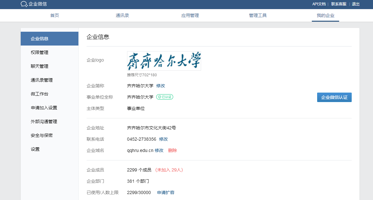 完成企業(yè)微信平臺(tái)的搭建。從2月11日開(kāi)始,網(wǎng)絡(luò)信息中心開(kāi)始搭建“齊齊哈爾大學(xué)企業(yè)微信”平臺(tái),由于企業(yè)微信以學(xué)校的基本組織結(jié)構(gòu)為基礎(chǔ)單位,每名教師都要在組織結(jié)構(gòu)中落實(shí)到科室、系部等,因此,落實(shí)任務(wù)人員多、工作量很大,網(wǎng)絡(luò)信息中心設(shè)置了孫涌泉、祝文生、孫家良、李玲玲等4名系統(tǒng)管理員,學(xué)校各單位設(shè)置1名管理員對(duì)本單位人員進(jìn)行邀請(qǐng)、加入、分類(lèi)、管理,同時(shí)在線開(kāi)展使用答疑、操作培訓(xùn)、技術(shù)問(wèn)題處理。在所有同志的配合下,用了三天時(shí)間,將2299名教職工加入企業(yè)微信平臺(tái),為下一步智慧校園建設(shè)和信息化應(yīng)用工作奠定了基礎(chǔ)。制作企業(yè)微信視頻會(huì)議教程文檔加入微云盤(pán)共享,為各單位使用企業(yè)微信召開(kāi)遠(yuǎn)程視頻會(huì)議提供方便。