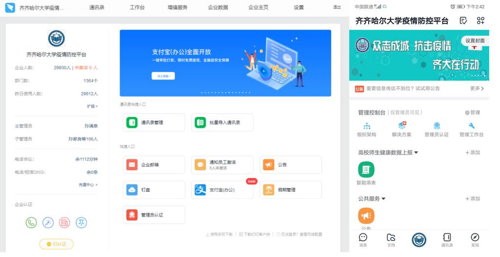 完成齊齊哈爾大學(xué)疫情防控平臺(tái)的部署與數(shù)據(jù)上傳。根據(jù)省教育廳文件精神,需要在全體師生中注冊(cè)釘釘并依托釘釘搭建齊齊哈爾大學(xué)疫情防控平臺(tái),用于向黑龍江省教育系統(tǒng)疫情防控平臺(tái)上報(bào)相關(guān)數(shù)據(jù)。20號(hào)接到任務(wù),23號(hào)平臺(tái)就要上線,時(shí)間緊任務(wù)量大,中心班子成員緊急動(dòng)員幾名黨員作為管理員,分工負(fù)責(zé)我校各部門(mén)師生的釘釘注冊(cè)信息全面核實(shí)、子管理員培訓(xùn)、數(shù)據(jù)導(dǎo)入導(dǎo)出、人員激活、各單位的管理體系構(gòu)建等工作。利用與完美數(shù)聯(lián)疫情防控平臺(tái)的對(duì)接,實(shí)現(xiàn)釘釘平臺(tái)組織架構(gòu),再將師生的信息核對(duì)導(dǎo)入,對(duì)管理員各種操作培訓(xùn),短短2天的時(shí)間,孫涌泉、祝文生、孫家良、宋峰、劉恩軍持續(xù)奮戰(zhàn)了近四十個(gè)小時(shí),在23日早八點(diǎn)完成全校29930人的數(shù)據(jù)導(dǎo)入與激活工作,設(shè)計(jì)適合學(xué)校風(fēng)格的釘釘用戶界面,確保系統(tǒng)在23日開(kāi)始正式上線運(yùn)行,實(shí)現(xiàn)全校師生每日“一鍵”報(bào)告?zhèn)€人健康情況。