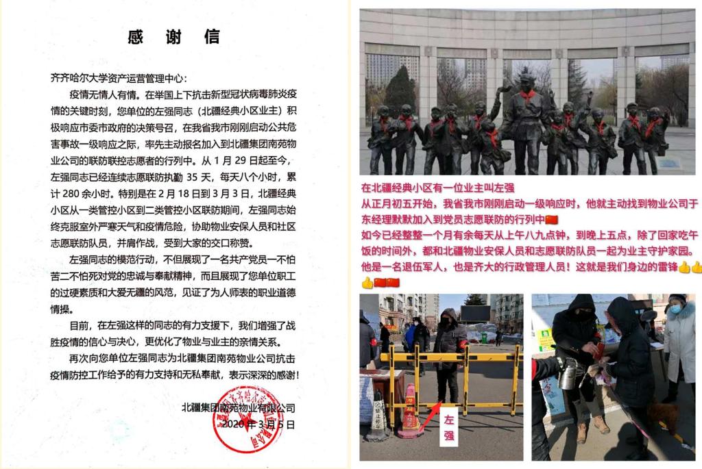 北疆集團(tuán)南苑物業(yè)有限公司在感謝信中表示,左強(qiáng)同志的模范行動,不但展現(xiàn)了一名共產(chǎn)黨員一不怕苦二不怕死精神以及對黨的忠誠與奉獻(xiàn)精神,而且展現(xiàn)了齊齊哈爾大學(xué)職工的過硬素質(zhì)和大愛無疆的風(fēng)范,見證了為人師表的職業(yè)道德情操。