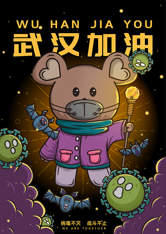 設(shè)計說明:作品以鼠年抗擊新冠病毒為主題,手執(zhí)法杖的鼠年精靈正在用光明驅(qū)散黑暗中的病毒,象征著治愈和希望。