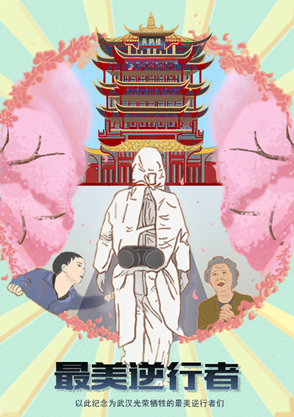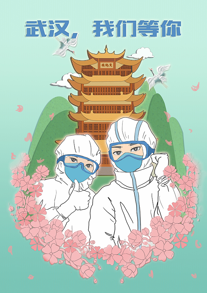 設(shè)計說明:此作品以白衣天使、黃鶴樓、武漢櫻花為元素向抗疫在一線的戰(zhàn)斗者致敬。你們不是孤軍奮戰(zhàn),中國14億人民和你們在一起,武漢的櫻花盛開,我們終將戰(zhàn)勝疫情,我們等你回家!