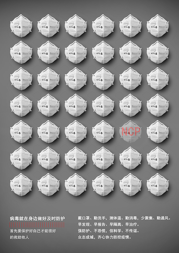 設(shè)計說明:以小面積的紅色與大面積的灰白色做對比,2019nCoV作為背景基礎(chǔ)圖形要素,揭示了目前防疫工作的嚴峻性。中間“口罩”象形圖形的設(shè)計與副標(biāo)題的文字,貫徹了習(xí)總書記在1月28日的指示精神。同時頌揚了在這場無形的硝煙戰(zhàn)役中最終會取得勝利的勇敢頑強的廣大中國人民。