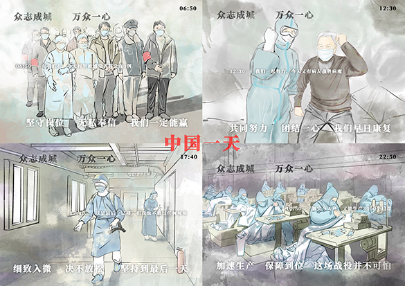 設(shè)計說明:作品以時間為線索,連續(xù)描寫在疫情期間各個階層、不同職業(yè)、不同地點的人們?yōu)榭箵粢咔楣餐M行的努力。