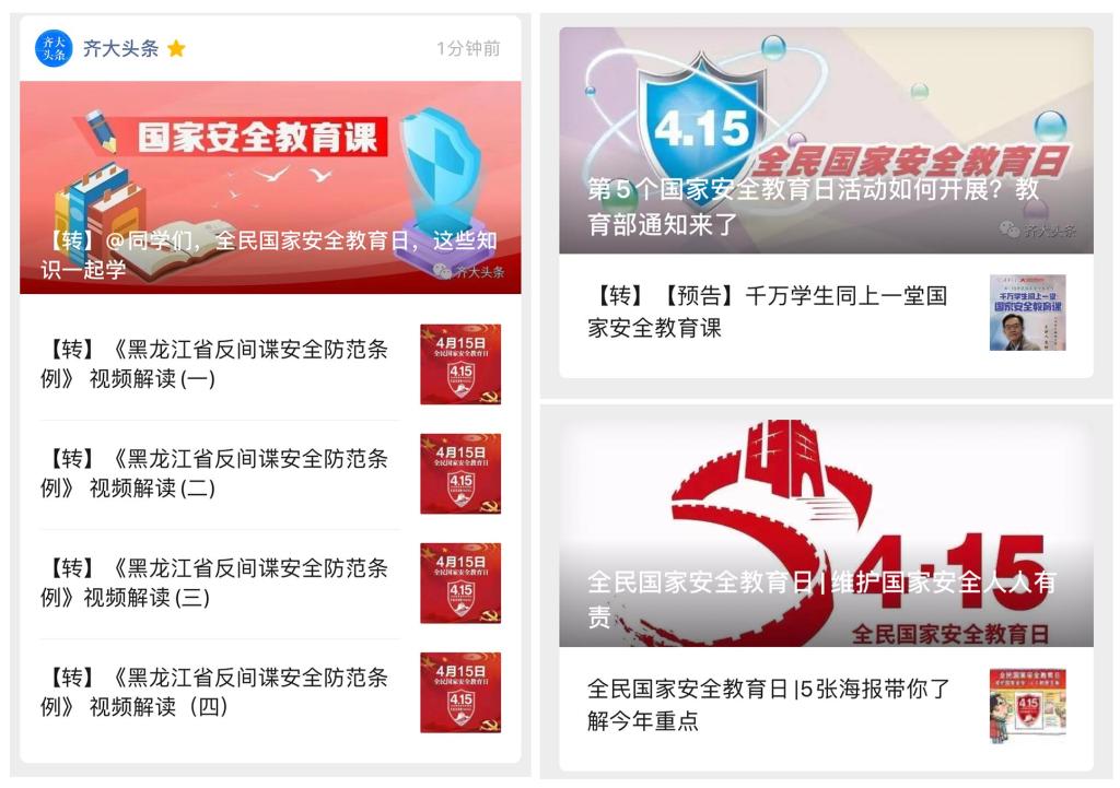 4月10日,黨委組織部組織全校副處級以上干部參加了全省國家安全知識網(wǎng)上答題活動,通過網(wǎng)上答題或手機APP答題方式,對“總體國家安全觀”及《中華人民共和國國家安全法》《中華人民共和國保密法》等相關(guān)應(yīng)知應(yīng)會知識進行答題。學(xué)校有針對性地組織學(xué)生開展了國家安全專題網(wǎng)絡(luò)學(xué)習(xí),號召全校學(xué)生參加“千萬學(xué)生同上一堂國家安全教育課”活動,通過“中國大學(xué)生在線”等網(wǎng)絡(luò)教育平臺觀看教育部組織錄制的由公共安全領(lǐng)域?qū)<?、中國工程院院士范維澄為全國大學(xué)生講授的《總體國家安全觀視角下的疫情防控》視頻公開課。通過學(xué)校網(wǎng)課平臺播放省國家安全廳專門編輯制作的《國安小劇場之龍江國安講堂——<黑龍江省反間諜安全防范條例>解讀》反間諜安全防范宣傳視頻,切實增強廣大師生維護國家安全的意識和能力。