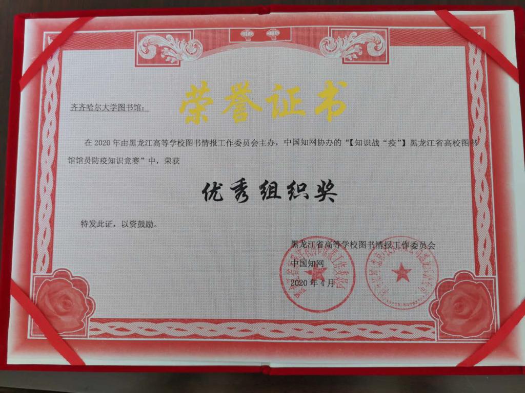 我館積極組織員工參與競賽活動,經(jīng)過一個月的激烈角逐,我館兩位老師獲得一等獎,12位老師獲得二等獎,齊齊哈爾大學被評為最佳組織獎,取得了可喜成績。