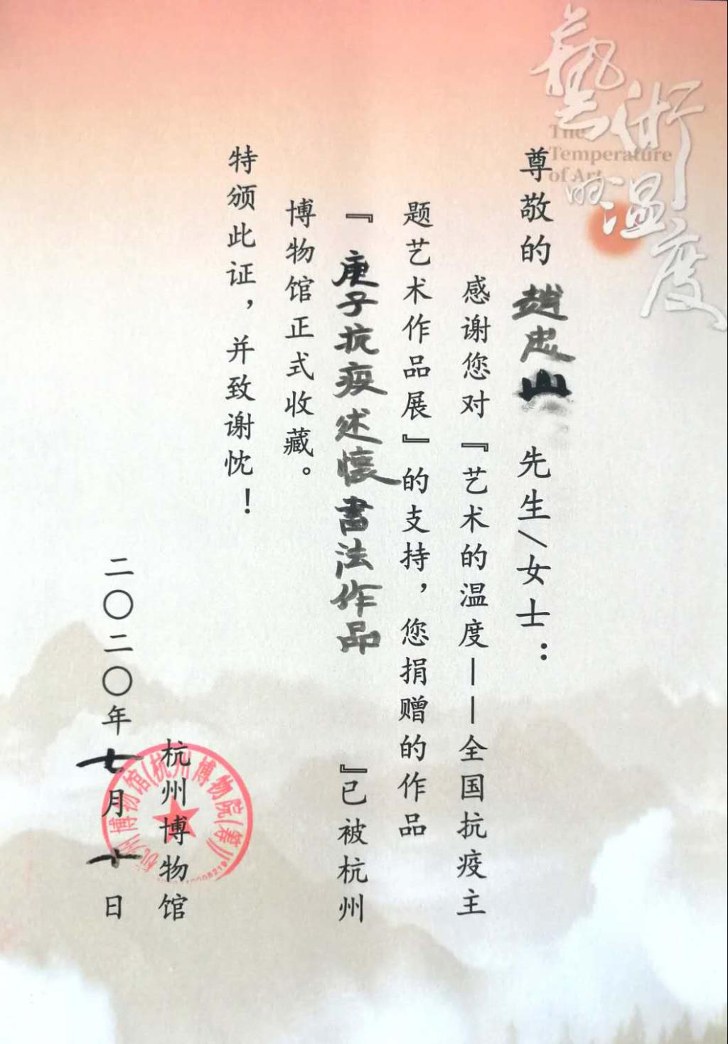 5月10日“藝術的溫度——全國抗疫主題藝術作品展”在杭州博物館開展。我校文學與歷史文化學院(新聞傳播學院)趙忠山教授的行書作品《抗疫述懷》成功入展,并被杭州博物館正式收藏。