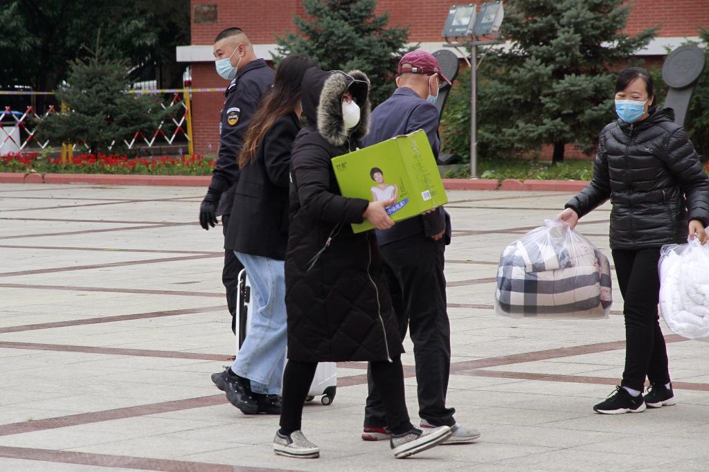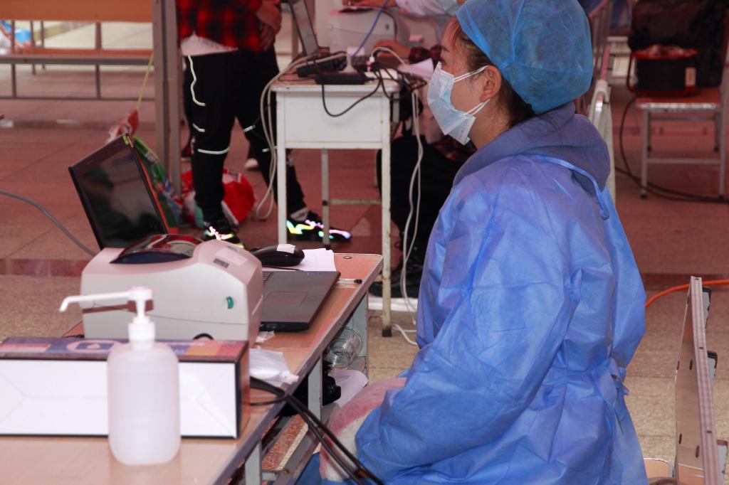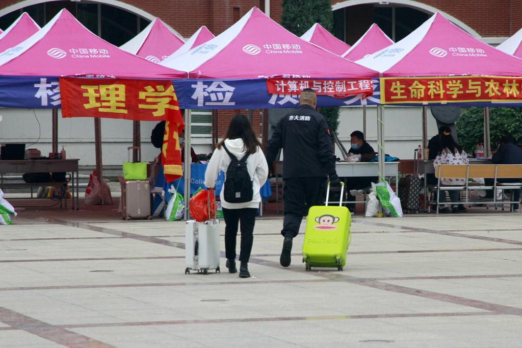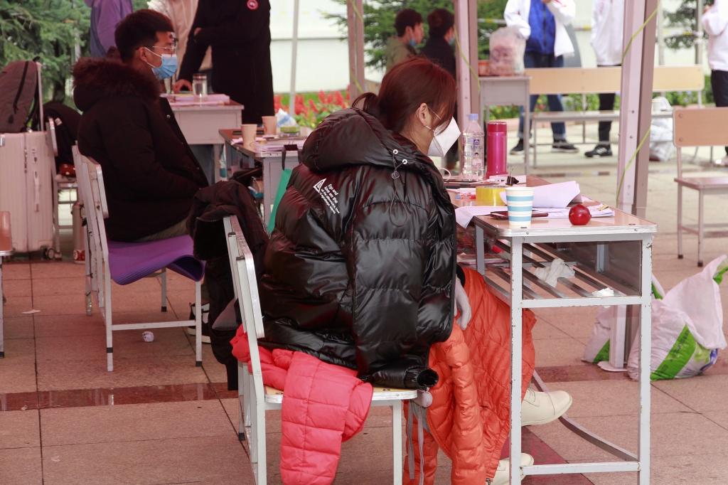雖然還是初秋,在中區(qū)和東區(qū)廣場接待點,由于學(xué)生錯峰分批陸續(xù)前來報道,迎接返校學(xué)生工作人員必須一直守候在露天室外。為了防寒保暖,一線的輔導(dǎo)員老師和志愿者們都穿上了厚厚的羽絨服,核酸檢測醫(yī)護人員也不得不在換崗時把手縮進熱寶里,羽絨服、熱寶、暖水瓶成了迎接返校學(xué)生工作人員的“防寒三件寶”。盡管如此,每當(dāng)有學(xué)生拎著行李箱來報道,迎接他們的都是熱情的笑臉和真誠的問候。