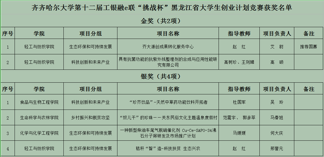 8月23日,由團省委、省教育廳、省科協(xié)、省學(xué)聯(lián)聯(lián)合主辦的第十二屆工銀融e聯(lián)“挑戰(zhàn)杯”黑龍江省大學(xué)生創(chuàng)業(yè)計劃競賽終審決賽在哈爾濱工程大學(xué)啟航活動中心隆重舉行,全省35所高校選送的209件創(chuàng)業(yè)項目作品參賽。8月31日,競賽結(jié)果公布,我校有13項作品獲獎,其中金獎2項、銀獎4項、銅獎7項,金獎作品中有1項入圍國賽。