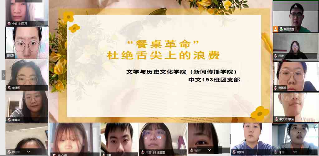 為切實培養(yǎng)學(xué)生節(jié)約習(xí)慣,引導(dǎo)形成“厲行節(jié)約、反對浪費”的新風(fēng)尚,通信與電子工程學(xué)院、文學(xué)與歷史文化學(xué)院、哲學(xué)與法學(xué)學(xué)院充分發(fā)揮校園文化的育人功能,組織學(xué)生召開了“餐桌革命”線上主題班會。在活動中,大家集思廣益,通過查擺校園中存在的浪費現(xiàn)象,有針對性地提出了解決問題的建議和辦法,使安靜就餐、使用公筷公勺、勤儉節(jié)約、健康飲食等理念更加深入人心。