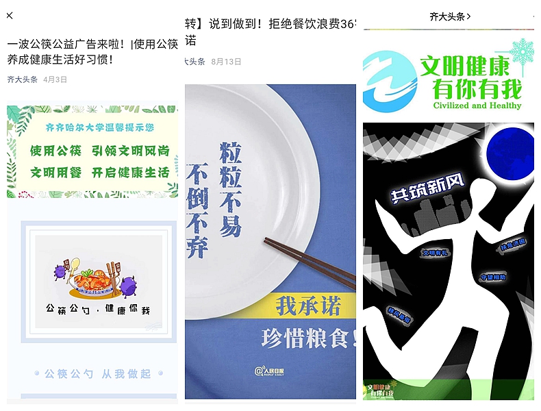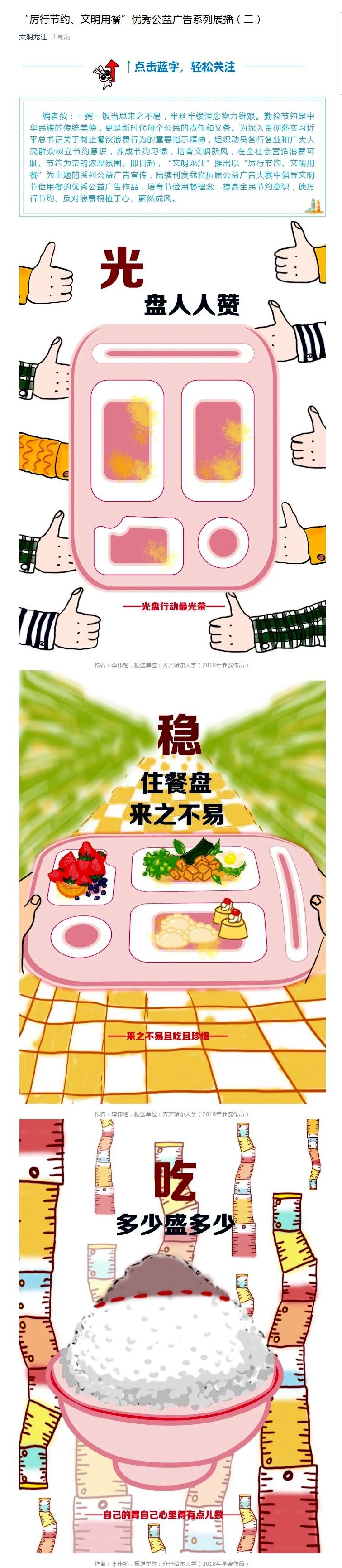文明校園樹新風(fēng),節(jié)儉教育結(jié)碩果。在全省“文明健康 有你有我”公益廣告優(yōu)秀作品征集活動中,我校24項作品入選并被省文明辦“文明龍江”公眾號宣傳推廣;9月1日,省文明辦“厲行節(jié)約、文明用餐”系列優(yōu)秀公益廣告宣傳展播,再次推廣了我校的3件優(yōu)秀入選作品。