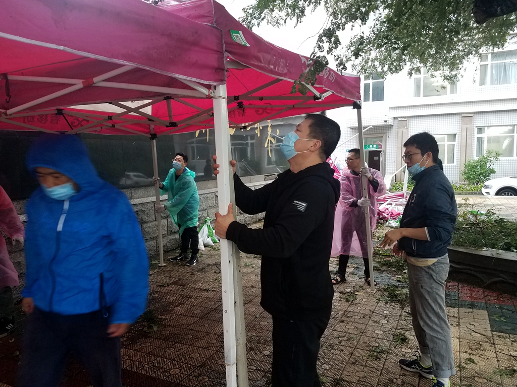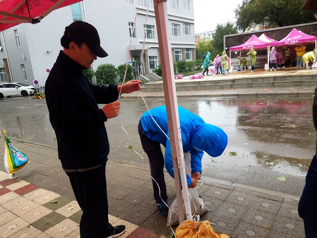 9月3日以來,受臺風(fēng)“美莎克”影響,齊齊哈爾全市出現(xiàn)強(qiáng)降雨、大風(fēng)天氣,我校校園中部分地段也出現(xiàn)積水等情況,4日下午,學(xué)生工作部(學(xué)生處)工作人員及各學(xué)院學(xué)生工作干部趟過積水來到中區(qū)和東區(qū)學(xué)生返校報(bào)到接待處,頂風(fēng)冒雨搭建遮雨棚等接待工作設(shè)施,為第二天同學(xué)們返校報(bào)到做好充足的準(zhǔn)備工作。