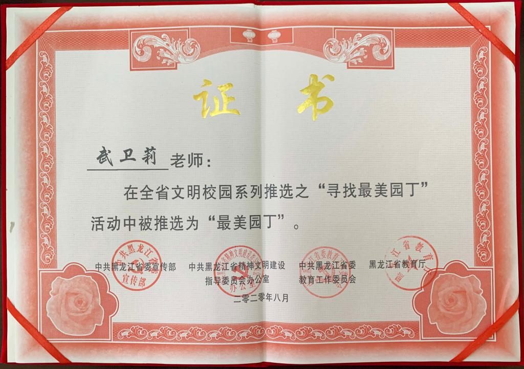 由于出色的班主任工作,2015年武衛(wèi)莉老師榮獲?!叭恕毕冗M(jìn)工作者標(biāo)兵;2016年被評(píng)為齊齊哈爾大學(xué)“班主任年度人物”。