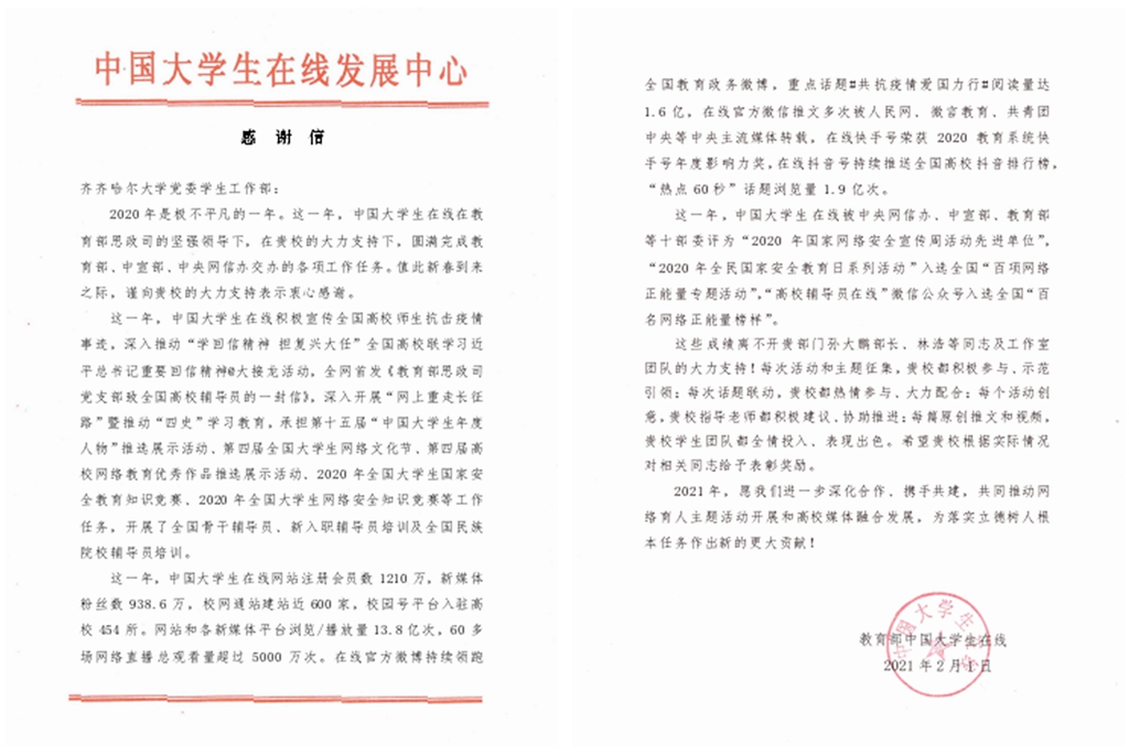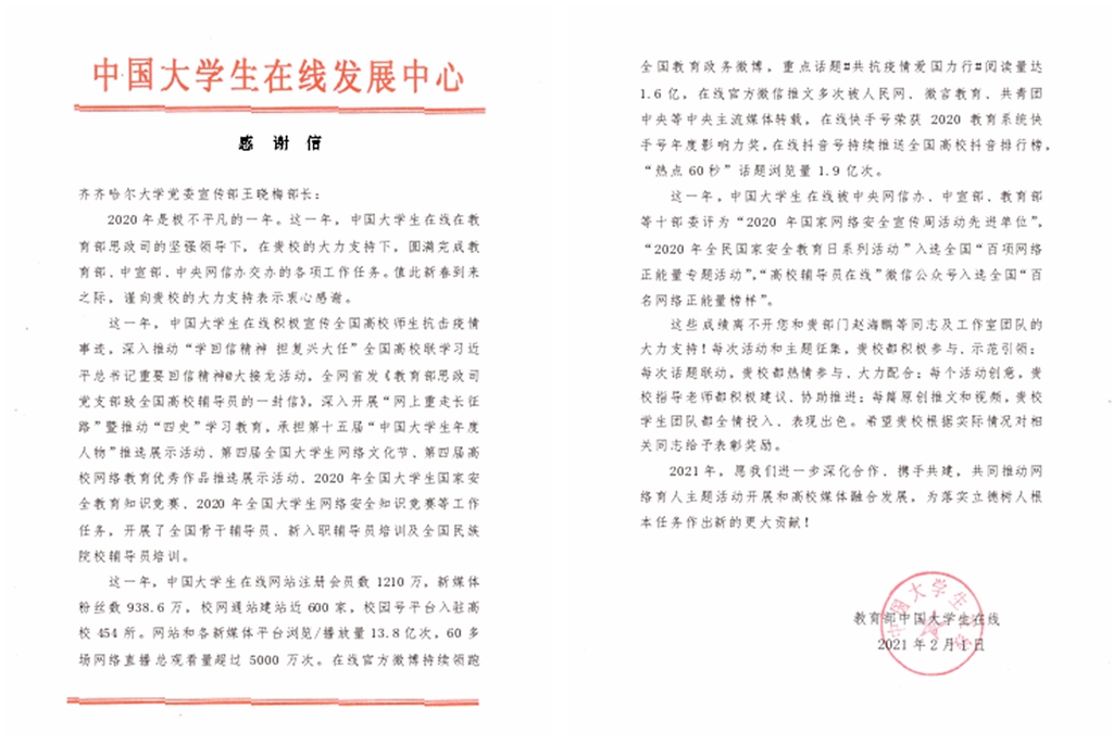 2月1日,教育部中國大學(xué)生在線向我校黨委常委、宣傳部長王曉梅和我校學(xué)生工作部(學(xué)生處)發(fā)來感謝信。信中表示,2020年是極不平凡的一年。這一年,中國大學(xué)生在線在教育部思政司的堅強領(lǐng)導(dǎo)下,在齊齊哈爾大學(xué)的大力支持下,圓滿完成教育部、中宣部、中央網(wǎng)信辦交辦的各項工作任務(wù)。值此新春到來之際,謹(jǐn)向齊齊哈爾大學(xué)的大力支持表示衷心感謝。