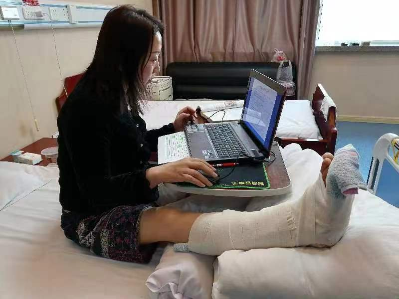 今年三月中旬,王莉娟老師被醫(yī)院確診為右腿腳踝骨粉碎性骨折,必須住院手術(shù)治療。家人擔(dān)心影響她身體康復(fù),反復(fù)勸說她同意同事幫她代課,可她卻毅然決然選擇了在病床上堅持為同學(xué)們線上授課。由于在腳部植入了鋼釘、鋼板,外面還要戴著厚重的石膏夾板,上課時她的腿需要一直抬高,酸麻難忍,在身體極度不適的情況下,王莉娟老師認(rèn)真上好了每一堂課,沒有絲毫松懈,一次都沒有耽誤教學(xué)。同學(xué)們每每看到她大汗淋漓的樣子,都像家人一樣倍感心痛,紛紛在公屏上為她點贊致謝??伤齾s笑著說,這沒什么,不是有一句話叫“共產(chǎn)黨員輕傷不下火線”嘛!