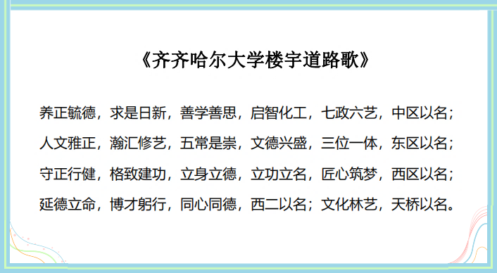 2022年3月30日,學(xué)校召開“校園建筑物及公共區(qū)域命名”專家委員會第七次工作會議。校黨委副書記齊宏偉出席會議并提出要求。會上,與會領(lǐng)導(dǎo)與專家認(rèn)真研究校黨委常委會反饋的《校園建筑物及公共區(qū)域命名》(討論稿)修改意見并形成定稿。提出對校園建筑物及公共區(qū)域的名稱進(jìn)一步準(zhǔn)確釋義,釋義原則上要凝練到40-60字之間,精準(zhǔn)闡釋樓宇、道路、天橋名稱,弘揚(yáng)中華優(yōu)秀傳統(tǒng)文化,為標(biāo)牌的制作作好準(zhǔn)備。經(jīng)過集體研討,全體專家一致通過了王則遠(yuǎn)創(chuàng)作的言簡意賅、易于記憶的《齊齊哈爾大學(xué)樓宇道路歌》: