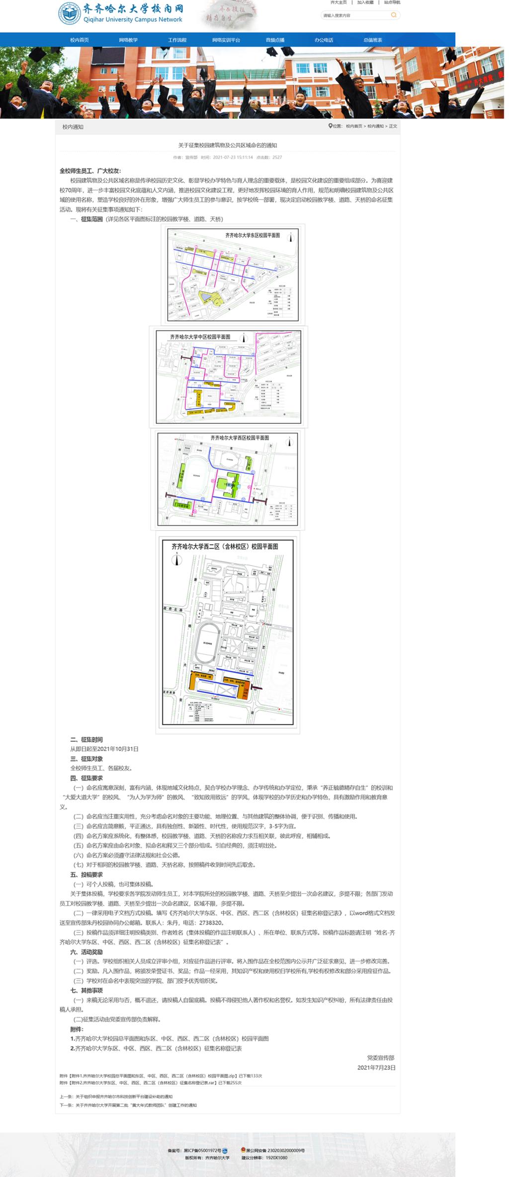 2021年7月23日,宣傳部正式發(fā)布《關(guān)于征集校園建筑物及公共區(qū)域命名的通知》,面向全校師生員工、各屆校友征集相關(guān)校園建筑物及公共區(qū)域名稱,收稿截止到10月31日。