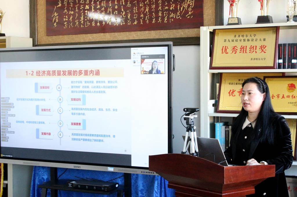 論壇上,我校經(jīng)濟與管理學(xué)院市場營銷系主任、市場營銷系-酒店管理系教師聯(lián)合黨支部書記齊秀輝教授,以《經(jīng)濟高質(zhì)量發(fā)展推進中國式現(xiàn)代化》為題,從經(jīng)濟高質(zhì)量發(fā)展和中國式現(xiàn)代化的深刻內(nèi)涵、我國現(xiàn)代化進程中的經(jīng)濟現(xiàn)狀與前景、經(jīng)濟高質(zhì)量發(fā)展推進中國式現(xiàn)代化的路徑等方面,對黨的二十大精神進行了系統(tǒng)闡釋。
