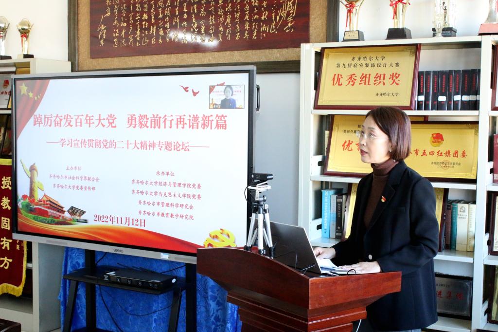 為深入學(xué)習(xí)宣傳貫徹黨的二十大精神,進一步加深全體師生對黨的二十大精神的理解和把握,11月12日下午,由學(xué)校黨委宣傳部、齊齊哈爾市社會科學(xué)界聯(lián)合會共同主辦,經(jīng)濟與管理學(xué)院黨委與馬克思主義學(xué)院黨委、齊齊哈爾市管理科學(xué)研究會、齊齊哈爾市教育教學(xué)研究院共同承辦的學(xué)習(xí)宣傳貫徹黨的二十大精神專題論壇在逸夫樓1304會議室成功舉行。