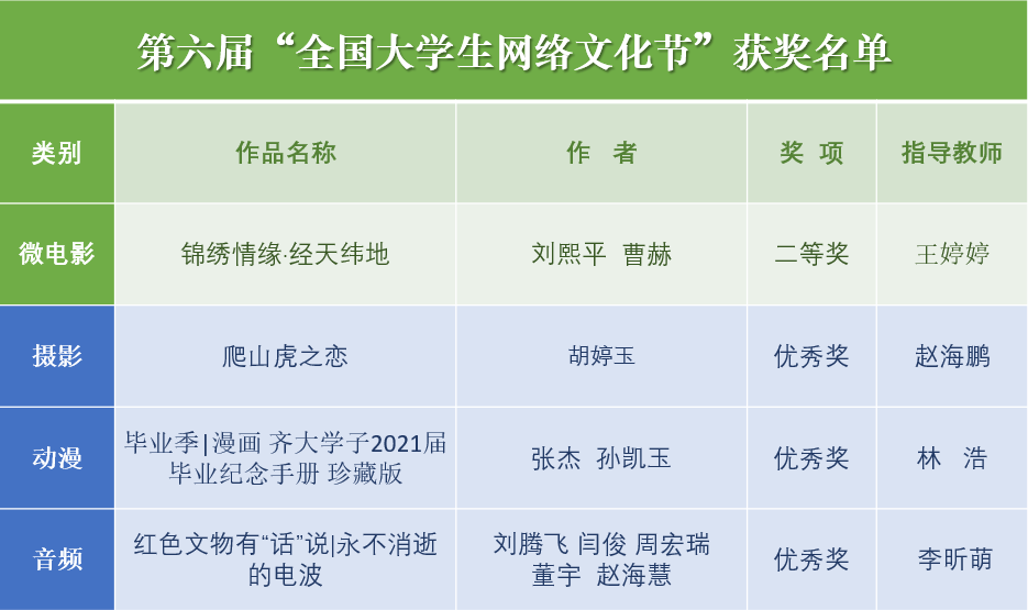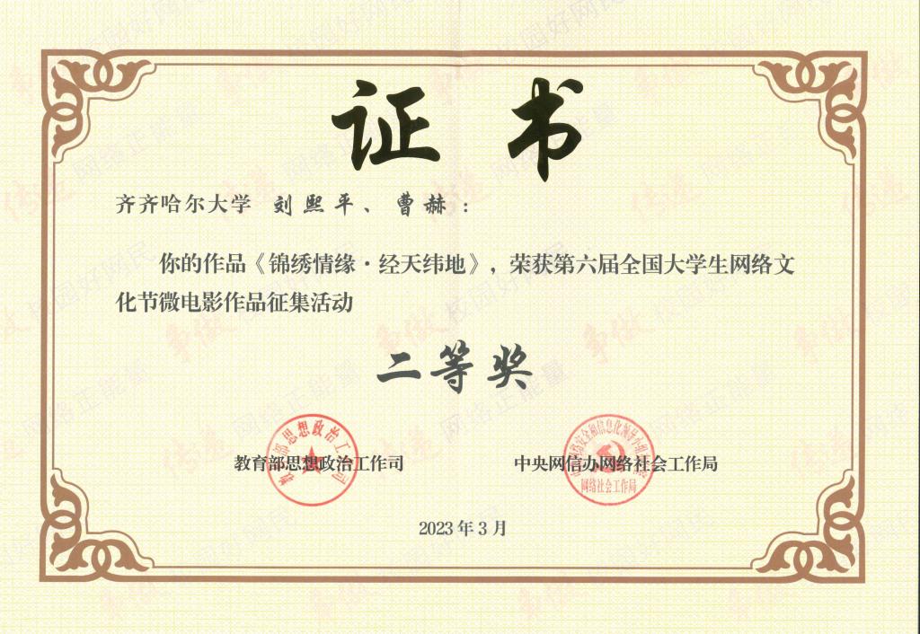 近日,由教育部思想政治工作司、中央網(wǎng)信辦網(wǎng)絡(luò)社會工作局主辦的第六屆“全國大學(xué)生網(wǎng)絡(luò)文化節(jié)”公布了遴選結(jié)果。我校斬獲全國二等獎1項,全國優(yōu)秀獎3項。其中,文學(xué)與歷史文化學(xué)院(新聞傳播學(xué)院)王婷婷老師指導(dǎo),劉熙平、曹赫同學(xué)創(chuàng)作的《錦繡情緣·經(jīng)天緯地》榮獲微電影類作品二等獎;齊齊哈爾大學(xué)廣播電臺胡婷玉同學(xué)的作品《爬山虎之戀》榮獲攝影類作品優(yōu)秀獎;易班工作室張杰、孫凱玉創(chuàng)作的《畢業(yè)季|漫畫 齊大學(xué)子2021屆畢業(yè)紀念手冊 珍藏版》榮獲動漫類作品優(yōu)秀獎;齊齊哈爾大學(xué)廣播電臺劉騰飛、閆俊、周宏瑞、董宇、趙海慧同學(xué)的作品《紅色文物有“話”說|永不消逝的電波》榮獲音頻類作品優(yōu)秀獎。