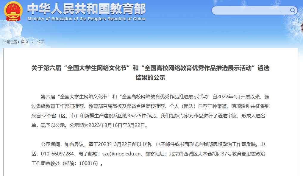 據(jù)悉,作為全國高校網(wǎng)絡(luò)思政領(lǐng)域最高級別競賽之一,第六屆“全國大學(xué)生網(wǎng)絡(luò)文化節(jié)”和“全國高校網(wǎng)絡(luò)教育優(yōu)秀作品推選展示活動” 兩項活動共征集到來自32個?。▍^(qū)、市)和新疆生產(chǎn)建設(shè)兵團的35225件作品。網(wǎng)絡(luò)文化節(jié)征集作品類型包括微視頻、微電影、動漫、攝影、網(wǎng)文、公益廣告、音頻、校園歌曲、其他類網(wǎng)絡(luò)創(chuàng)新作品等9類。網(wǎng)絡(luò)教育優(yōu)秀作品包括優(yōu)秀網(wǎng)絡(luò)文章、優(yōu)秀工作案例、優(yōu)秀微課、優(yōu)秀新媒體作品等4類。此次,我校共推薦九類134個作品參賽。