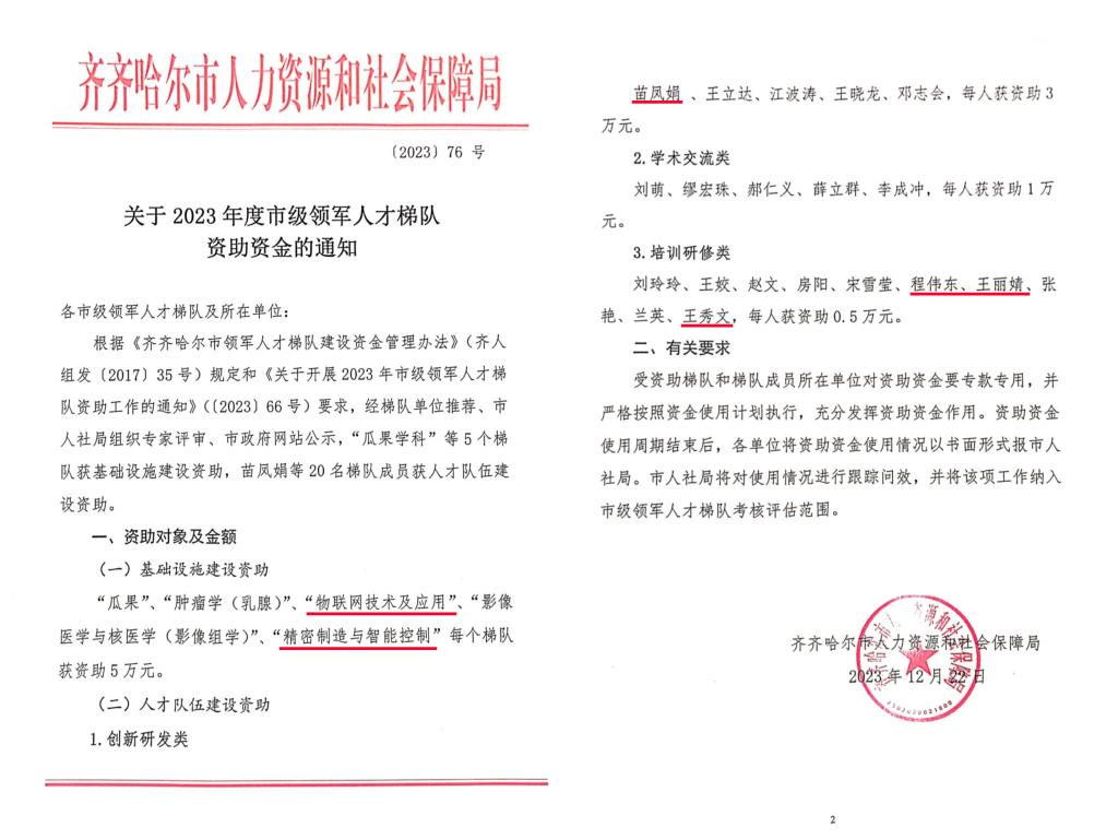 據(jù)悉,根據(jù)《齊齊哈爾市領(lǐng)軍人才梯隊(duì)建設(shè)資金管理辦法》(齊人組發(fā)(2017)35號(hào))規(guī)定和《關(guān)于開展 2023 年市級(jí)領(lǐng)軍人才梯隊(duì)資助工作的通知》((2023) 66 號(hào))要求,經(jīng)梯隊(duì)單位推薦、市人社局組織專家評(píng)審、市政府網(wǎng)站公示,“瓜果學(xué)科”等 5個(gè)梯隊(duì)獲基礎(chǔ)設(shè)施建設(shè)資助,苗鳳娟等 20 名梯隊(duì)成員獲人才隊(duì)伍建設(shè)資助。