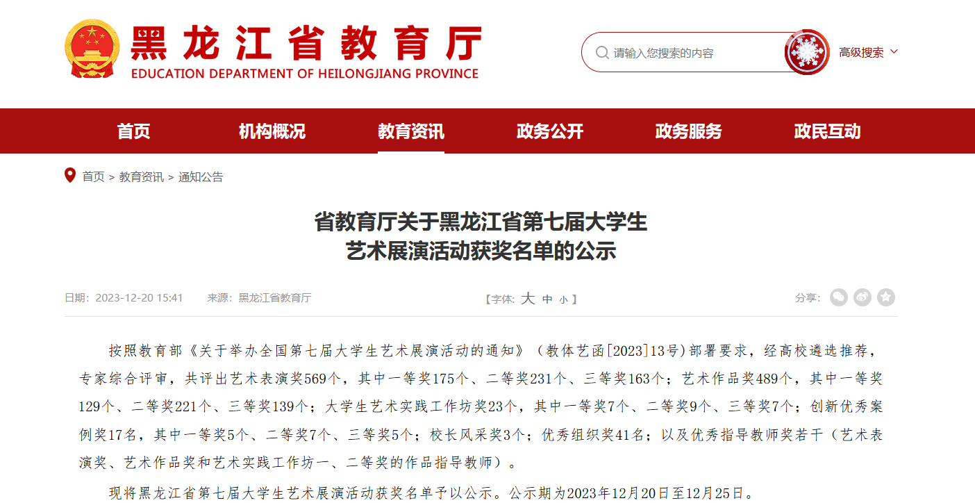 近日,由黑龍江省教育廳主辦的全省第七屆大學(xué)生藝術(shù)展演活動評選結(jié)果揭曉。我校參賽項(xiàng)目成績優(yōu)異,共上報參賽作品68項(xiàng),獲獎63項(xiàng),其中一等獎29項(xiàng),二等獎25項(xiàng)、三等獎9項(xiàng),獲獎數(shù)量、層次均有新突破,是我校文化育人實(shí)踐成果的生動體現(xiàn)。