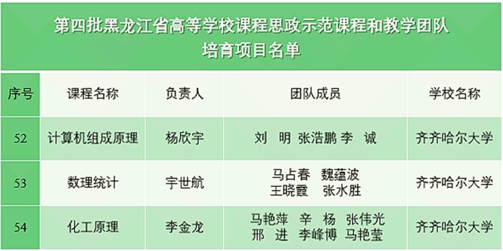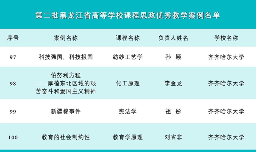 近日,黑龍江省教育廳公布黑龍江省高等學校第四批課程思政示范課程和教學團隊培育項目和第二批課程思政優(yōu)秀教學案例名單。齊齊哈爾大學3門本科課程入選第四批黑龍江省高等學校課程思政示范課程和教學團隊培育項目,4個教學案例獲批第二批黑龍江省高等學校課程思政優(yōu)秀教學案例。截至目前,學校共獲批省級課程思政示范項目12項,省級課程思政優(yōu)秀教學案例8個,在省屬同類院校中居于前列。