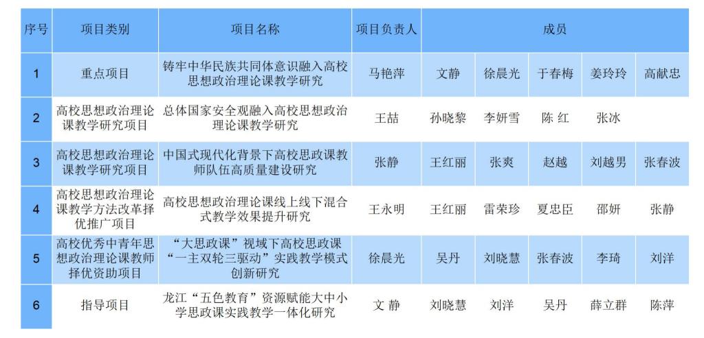 日前,黑龍江省教育廳公布了2023年度黑龍江省高等教育教學(xué)改革項(xiàng)目思想政治理論課教學(xué)改革研究專項(xiàng)研究立項(xiàng)結(jié)果通知,我校馬克思主義學(xué)院共有6項(xiàng)課題獲批立項(xiàng)。