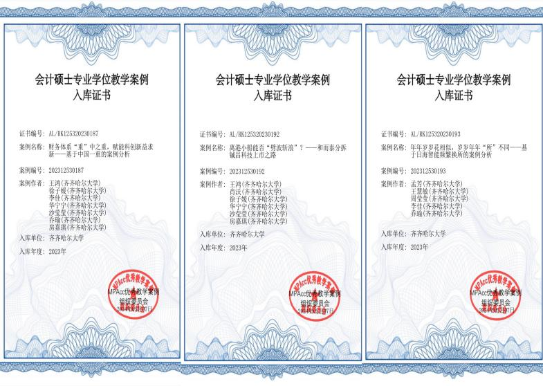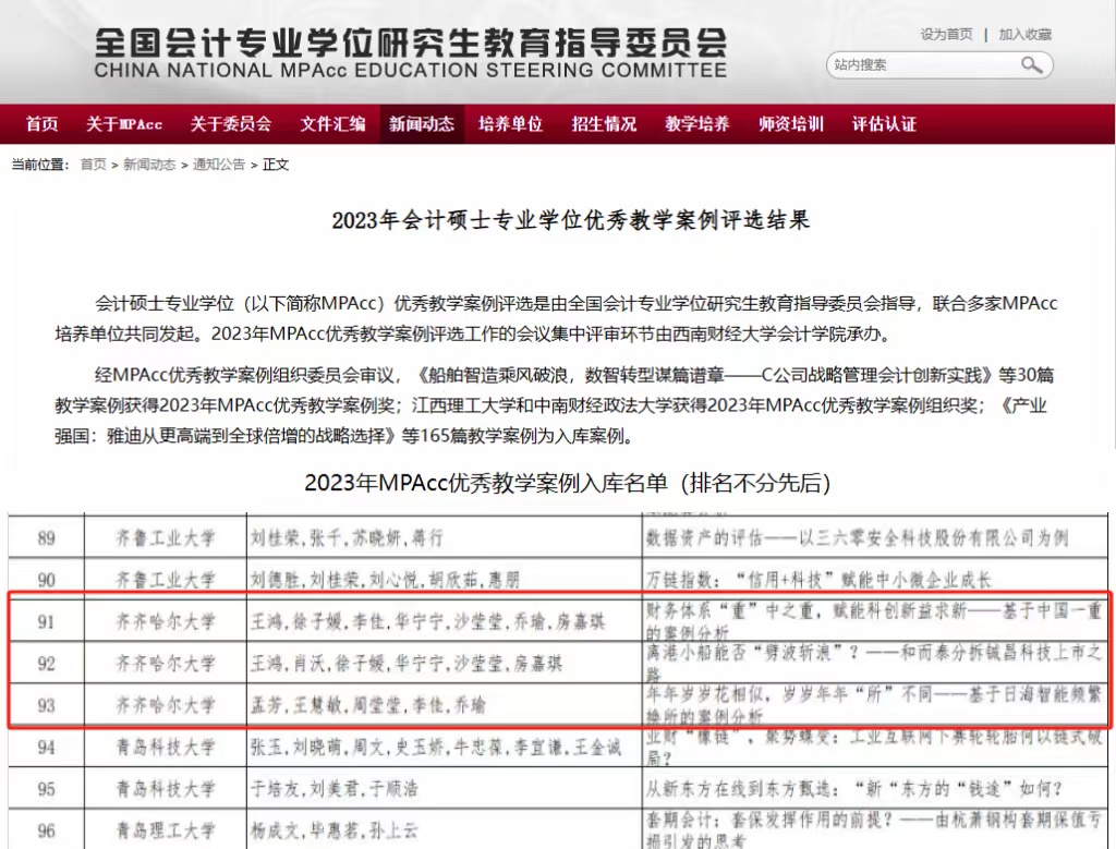 5月8日,全國會計專業(yè)學位研究生教育指導委員會正式公布2023年MPAcc(會計碩士)優(yōu)秀教學案例入庫名單。經(jīng)評選,全國共有165篇教學案例入選國家?guī)?,黑龍江省?篇入選,其中我校3篇,分別為經(jīng)濟與管理學院王鴻教授團隊編寫的《財務體系“重”中之重,賦能科創(chuàng)新益求新——基于中國一重的案例分析》《離港小船能否“劈波斬浪”?——和而泰分拆鋮昌科技上市之路》、孟芳副教授團隊編寫的《年年歲歲花相似,歲歲年年“所”不同——基于日海智能頻繁換所的案例分析》。