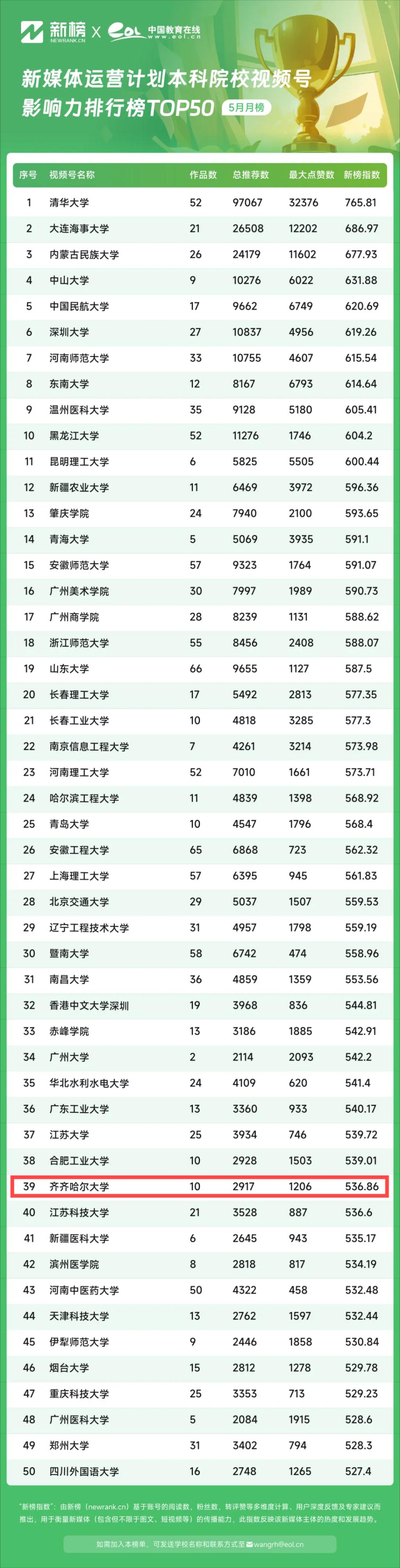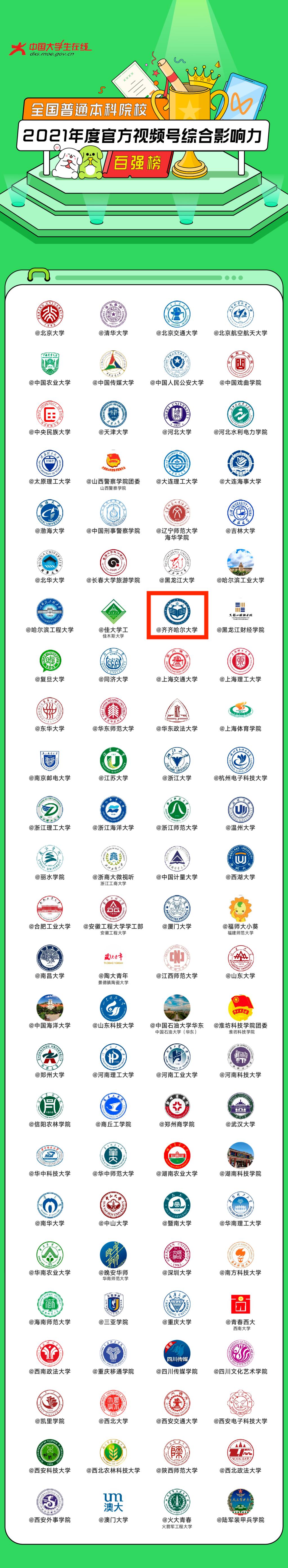近日,中國教育在線聯(lián)合國內(nèi)權(quán)威新媒體評估機構(gòu)--新榜,對中國教育在線新媒體運營提升計劃聯(lián)盟高校的新媒體數(shù)據(jù)進行盤點,制作了首期高校新媒體運營TOP50榜單。在5月的中國教育在線新媒體運營計劃本科院校微信公眾號影響力排行榜TOP50中,“齊齊哈爾大學(xué)”官方視頻號位列第39位。