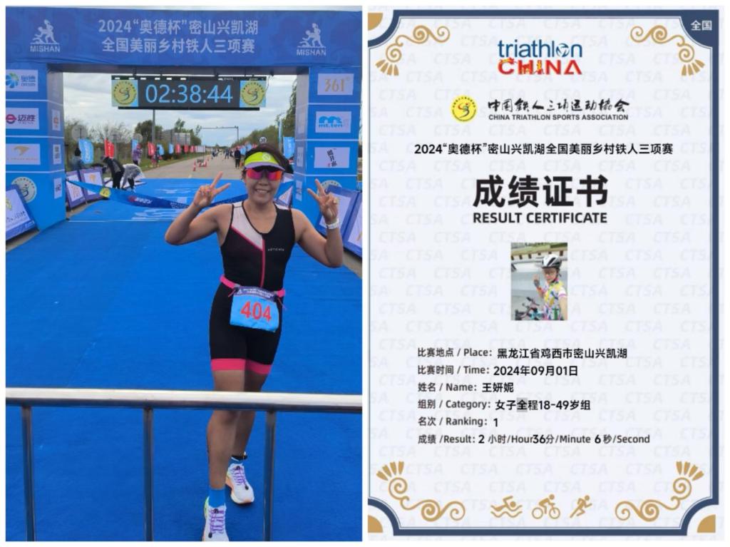 9月1日,2024“奧德杯”密山興凱湖全國(guó)美麗鄉(xiāng)村鐵人三項(xiàng)賽激情開(kāi)賽,我校體育學(xué)院教師王妍妮獲得女子全程18-49歲組冠軍,并獲得大眾全程組健將級(jí)別榮譽(yù)。