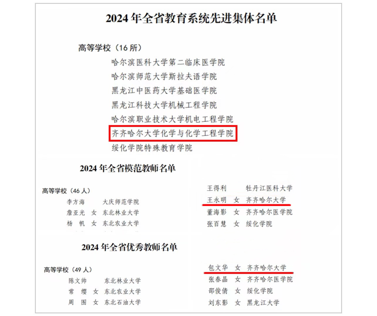 近日,省人力資源社會保障廳、省教育廳公布了2024年全省教育系統(tǒng)先進集體和先進個人擬表彰對象,我?;瘜W(xué)與化學(xué)工程學(xué)院榮獲“2024年度全省教育系統(tǒng)先進集體”榮譽稱號,馬克思主義學(xué)院王永明教授榮獲“2024年全省模范教師”榮譽稱號,音樂與舞蹈學(xué)院包文華教授榮獲“2024年全省優(yōu)秀教師”榮譽稱號。